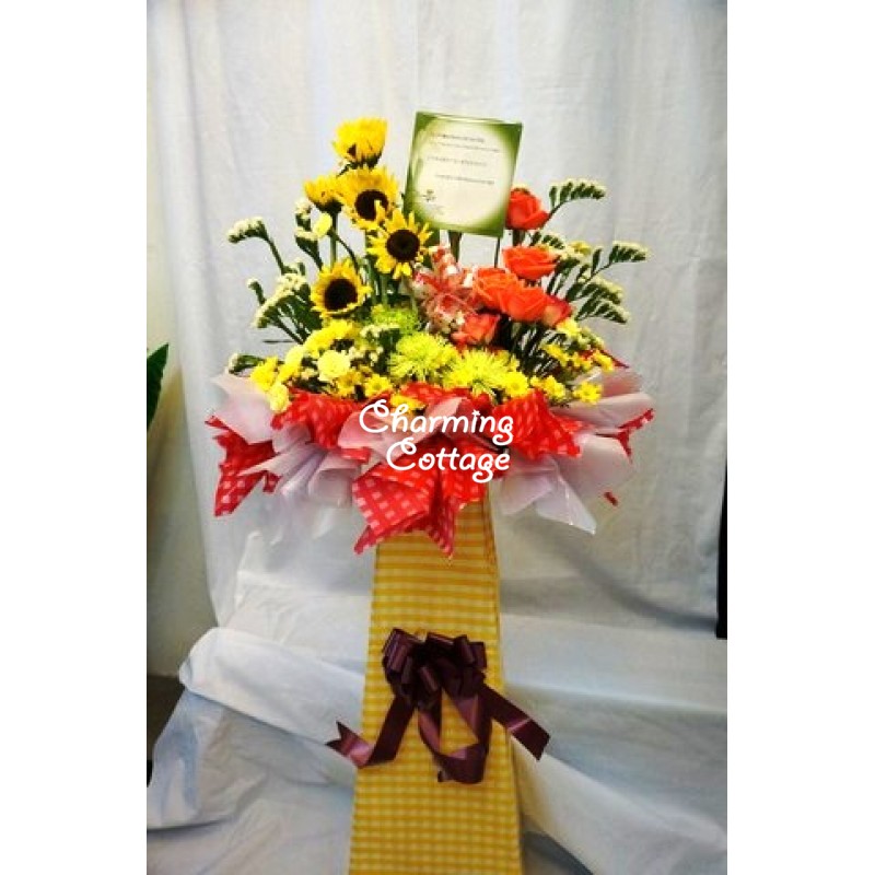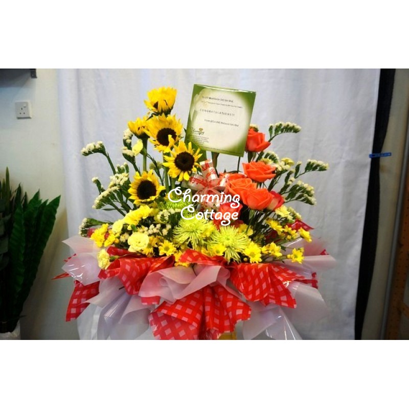sunflowers, roses, assorted chysanthemum, statice and others decorated with colorful wrappersand ribbons
