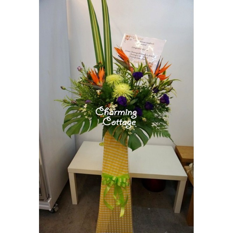 birds of paradise, purple eustomas, white waxflowers, red berries, assorted filler accompanied with long pandamas and giant monstera leaves.
