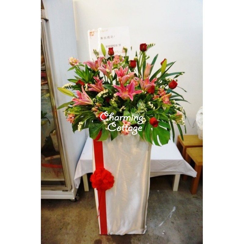 red is the color for this flower design, red lilies, red astromerias, red roses, accompanied with euphobia leaves, white statices, song of indias, monsteras leavea and raphis palms decorated with nicely decorated box stand ..very elegant and eye catching. Ideal figt for auspicious celebrations
