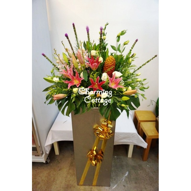 another stunning flower design- red lilies, wild ginger, white and yellow eustomas, pink orchids, liatris and assorted giant monstera leaves etc..