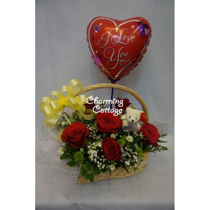 6 sweet red roses with others together with a cute teddy bear and a foil balloon .. lovely way to express your love