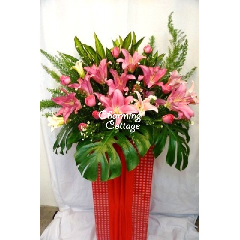 lilies, roses, and assorted leaves with colorful box stand.this floral design creates glamour strikes.