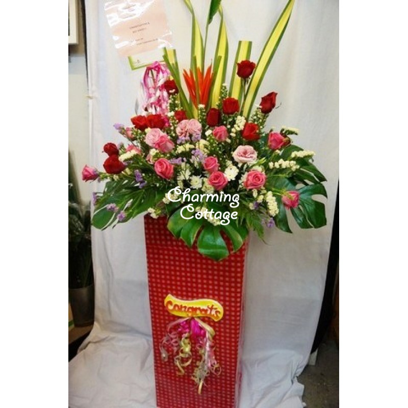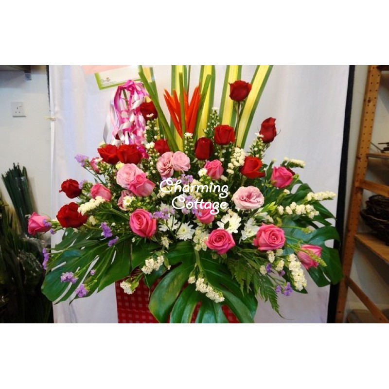 musa, roses, purple & white statice, white daisy, accompanied with giant padamas tall leaves and monstera leaves. It is a superb flower design that warms up everyone's heart.
