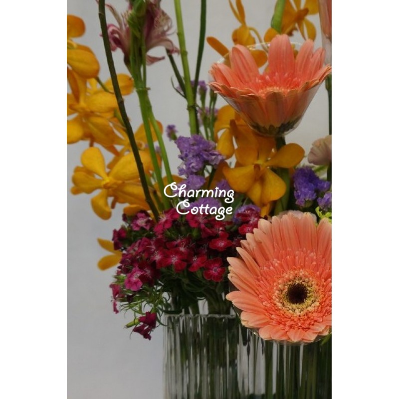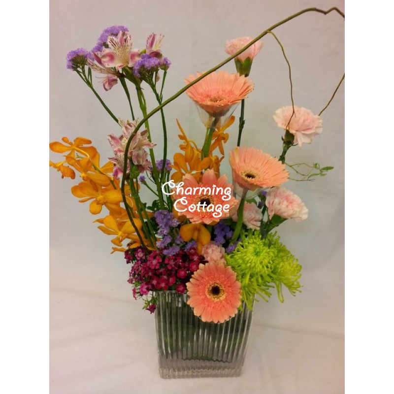 mixture of flowers, and a salix twist all nicely arranged in an exclusive tall heavy  rectangular vase, this bouquet adds colors and definitely will brightens up the space and bring cheers to your loved ones.