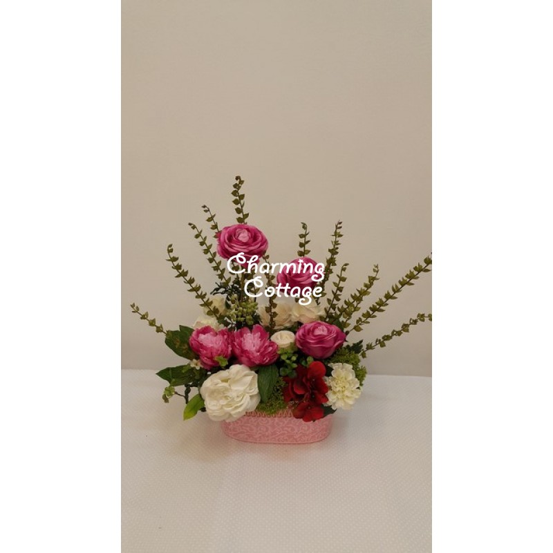 a great match of pink and white roses and others in a metal oval shaped pink vase. Ideal for raya celebrations!