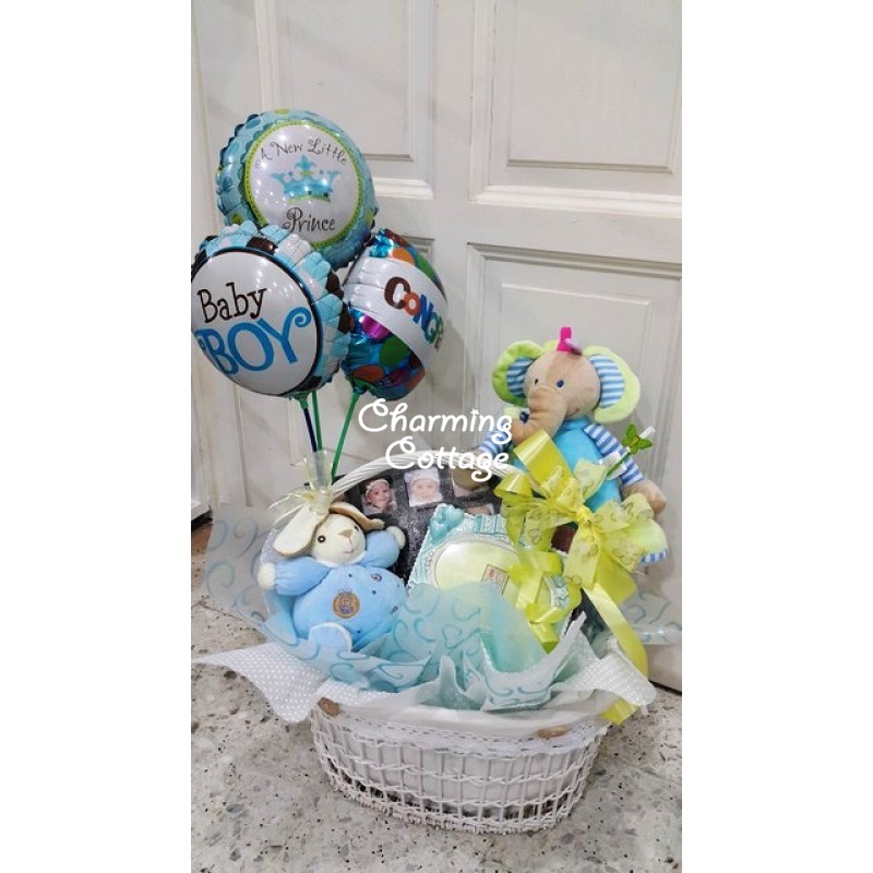 this baby gift is a great gift, 2 super exclusive photoframes accompanied with 2 baby soft toys and decorated with foil balloons all