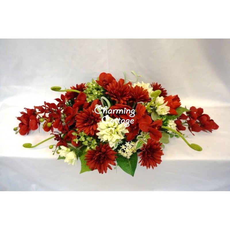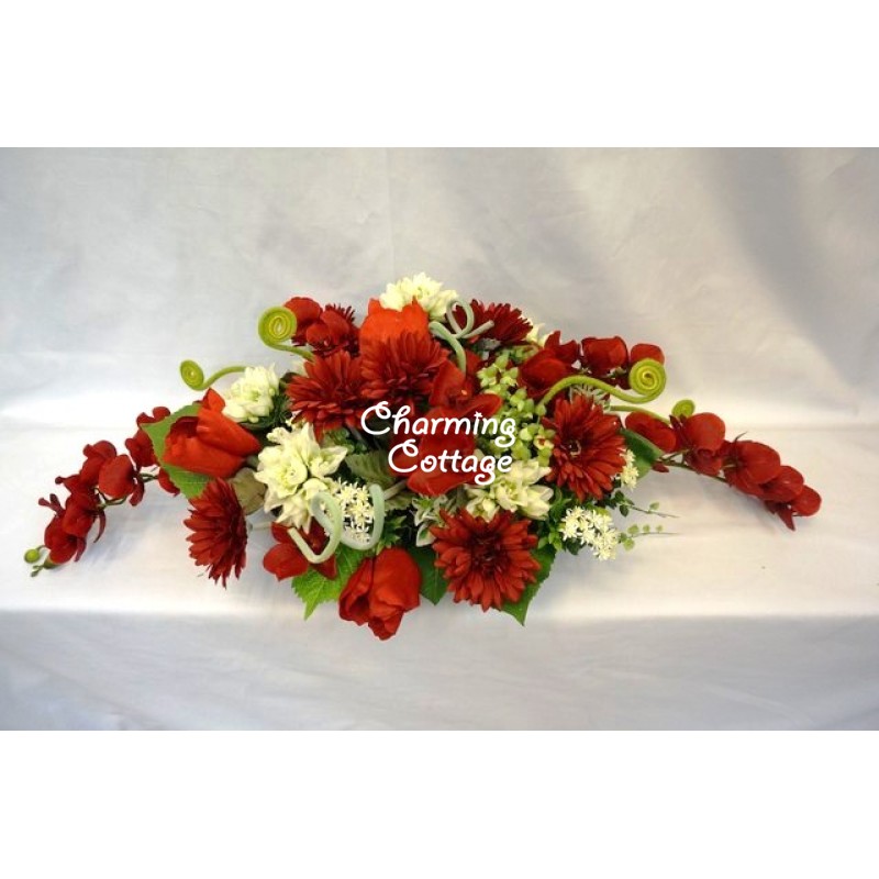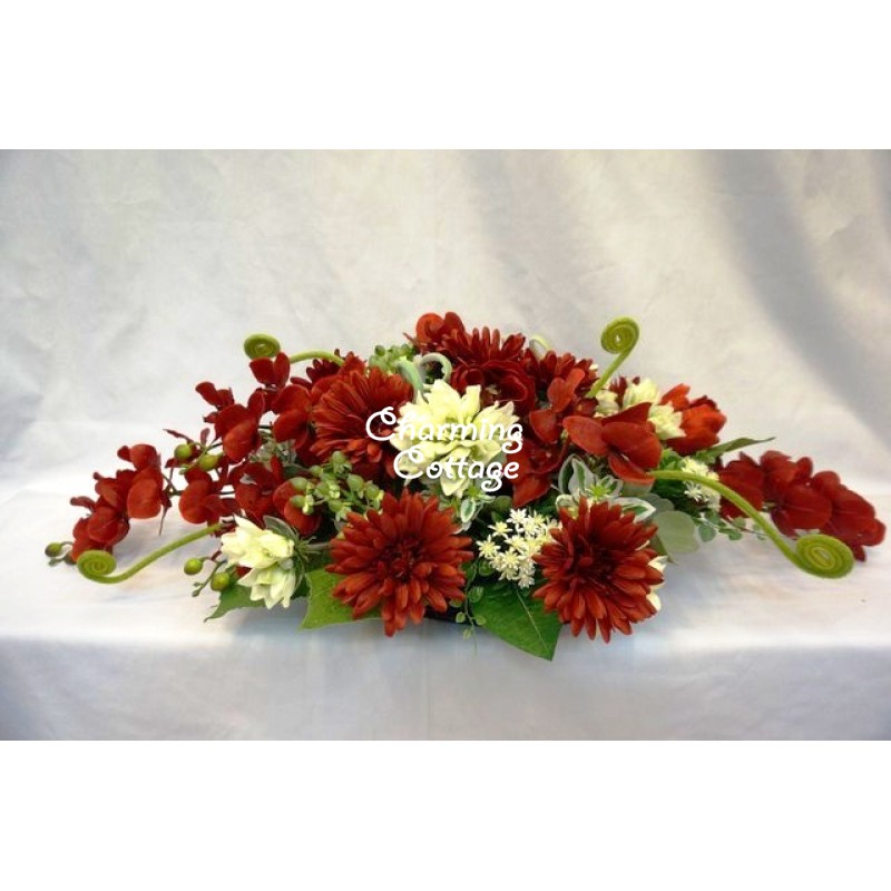Red and white will never go wrong for house warming or any auspicious occasions..red gebras, red orchids accompanied with white fillers and leaves all in a rattan basket. Its horizontal shape is ideal as table décor for rectangular shape coffee table or reception table in the office.