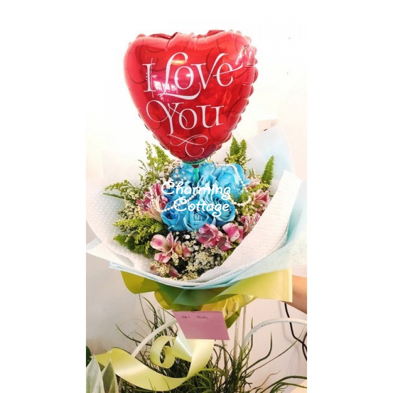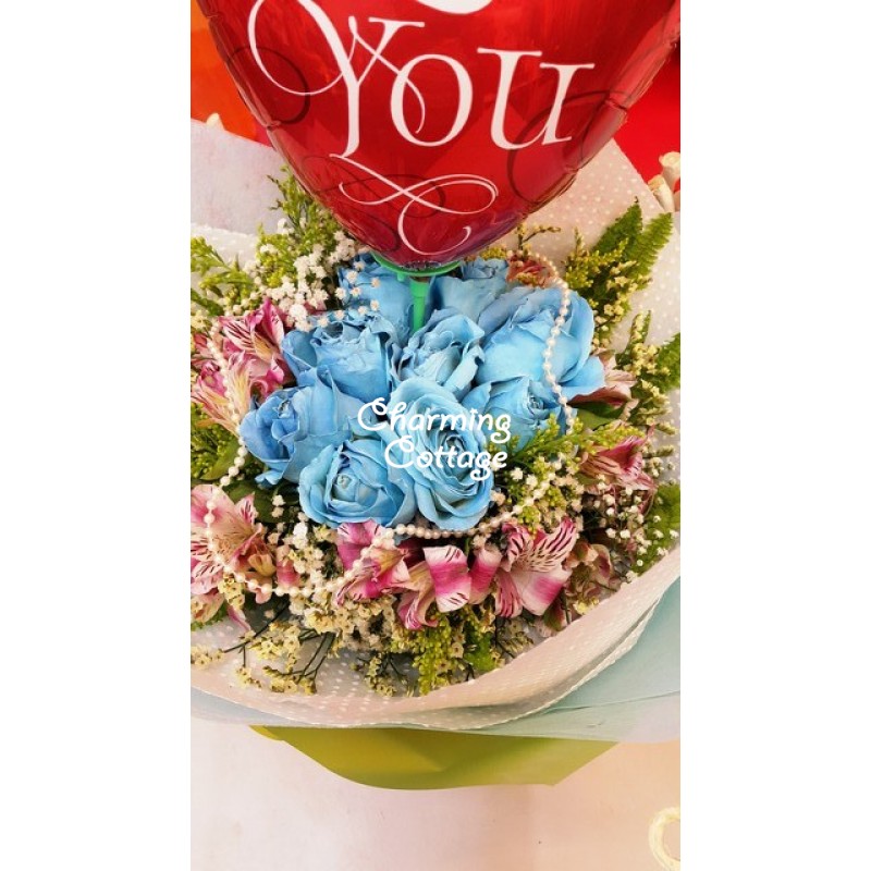 show your deep affection of love with this blue rose bouquet. It comes with 10 blue Roses with imported fillers and a heart shaped foil balloon :)