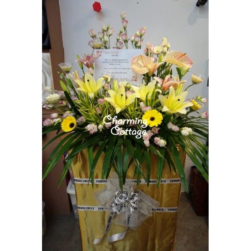 this wreath using light pink eustomas, anthuriums, yellow and pink lilies, gebras, raphis palms etc