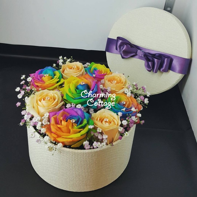 Rainbow & Champagne Roses in Exclusive Ivory Round Box along with a cute Purple Ribbon~ PREORDER for RAINBOW roses :)